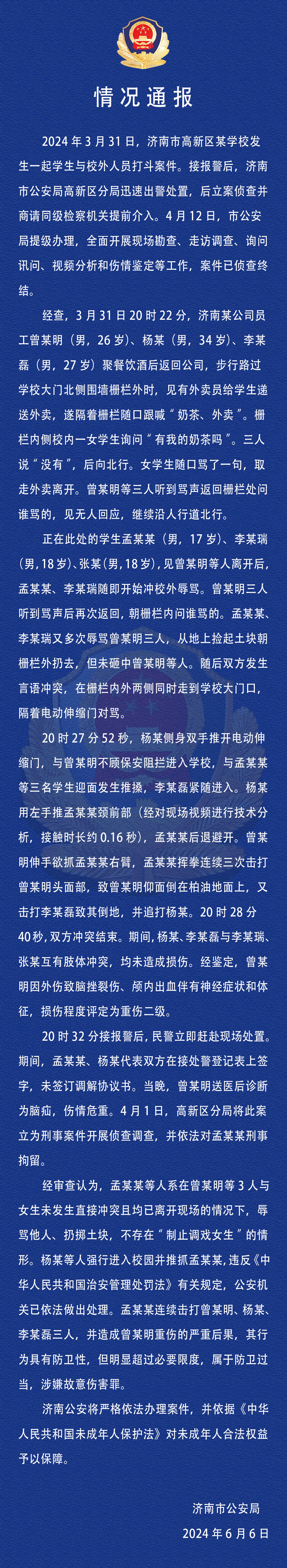近日济南发生一起学生与醉汉冲突事件引发关注刚刚当地公安局发布情况通报一起来看看!通报全文如下▼“学生与醉汉冲突案”时间线梳理3月31日晚,济南电子机械工程学校内发生一起校外人员与学生间的冲突事件。多位