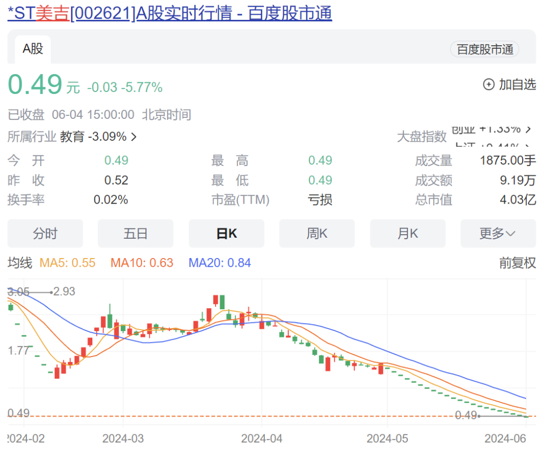 “早教第一股”美吉姆,要退市了。昨日,*ST美吉(002621.SZ,下称“美吉姆”)开盘再次一字跌停,股价只剩0.49元,总市值还有4.03亿元。截至收盘,美吉姆股价已连续22个交易日跌停,连续14