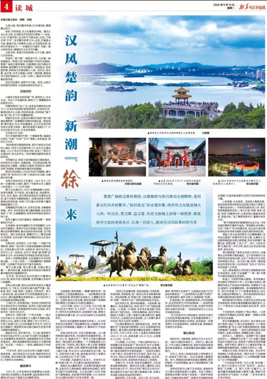 古城徐州的新生不仅在于高楼林立的城市更在于千年汉风与现代潮流的完美融合让历史文化在现代生活中焕发全新魅力9月15日《新华每日电讯》“读城”整版聚焦徐州这座历史文化名城以《汉风楚韵 新潮“徐”来》为题深