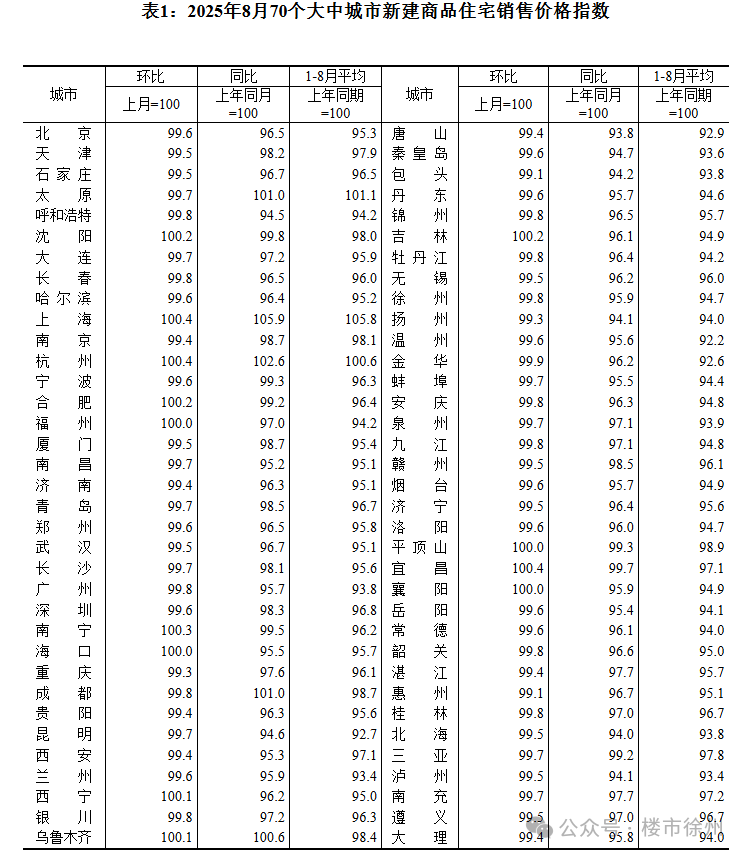 国家统计局发布2025年8月份70个大中城市商品住宅销售价格变动情况,各城市8月份的房价基本都在跌。★先看全国情况新房方面8月份,一线城市新建商品住宅销售价格环比下降0.1%,降幅比上月收窄0.1个百