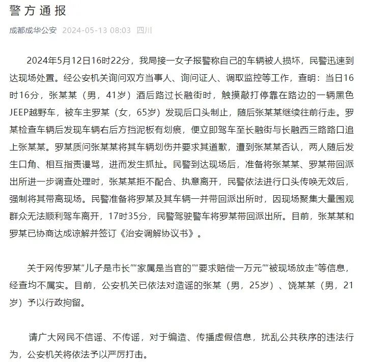 5月12日,网传成都市成华区长融街一太婆开的吉普越野车被路人摸了一下,太婆让其赔偿一万元并打了人。在报警后,路人被粗暴带走,群众不干了,把车围了起来,太婆在警察的保护下离开了现场。5月13日,成都市公