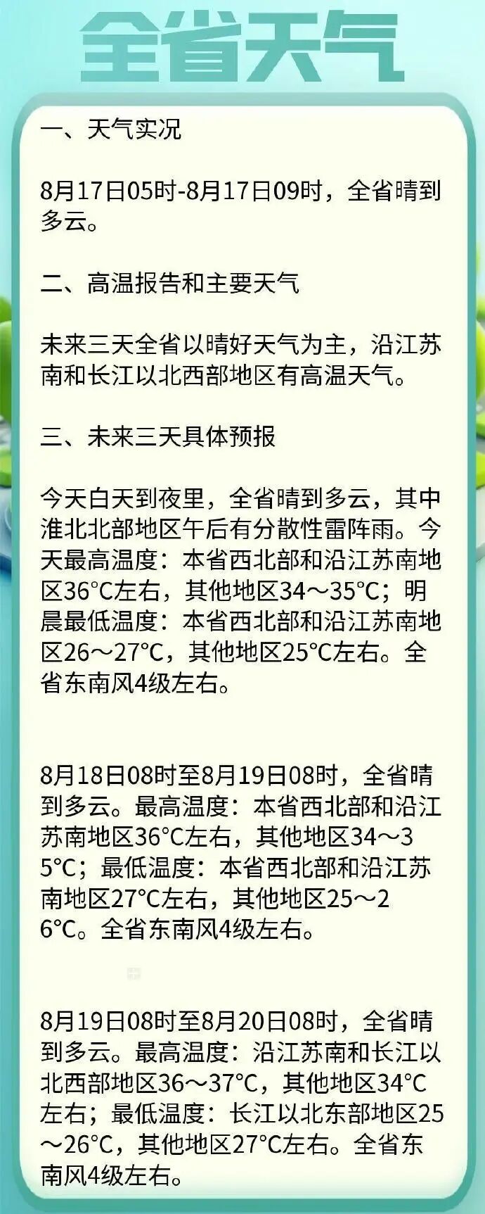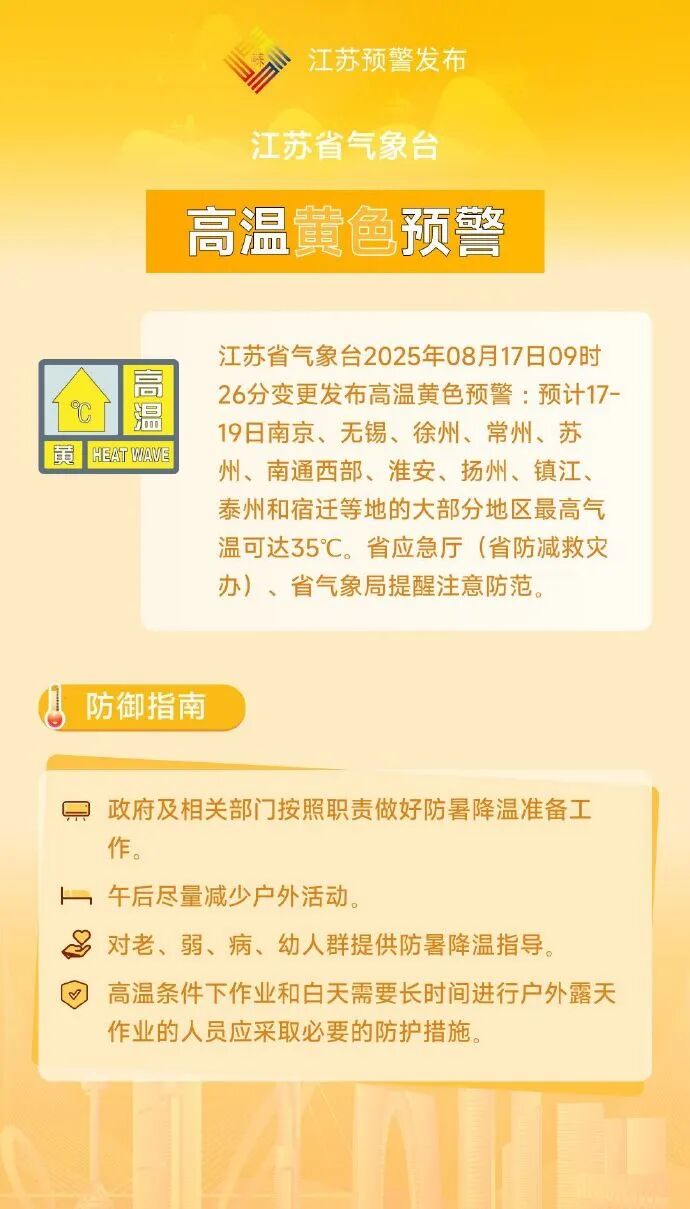刚刚江苏省气象台变更发布高温黄色预警预计17-19日南京、无锡、徐州、常州、苏州南通西部、淮安、扬州、镇江泰州和宿迁等地的大部分地区最高气温可达35℃省应急厅(省防减救灾办)、省气象局提醒注意防范全省
