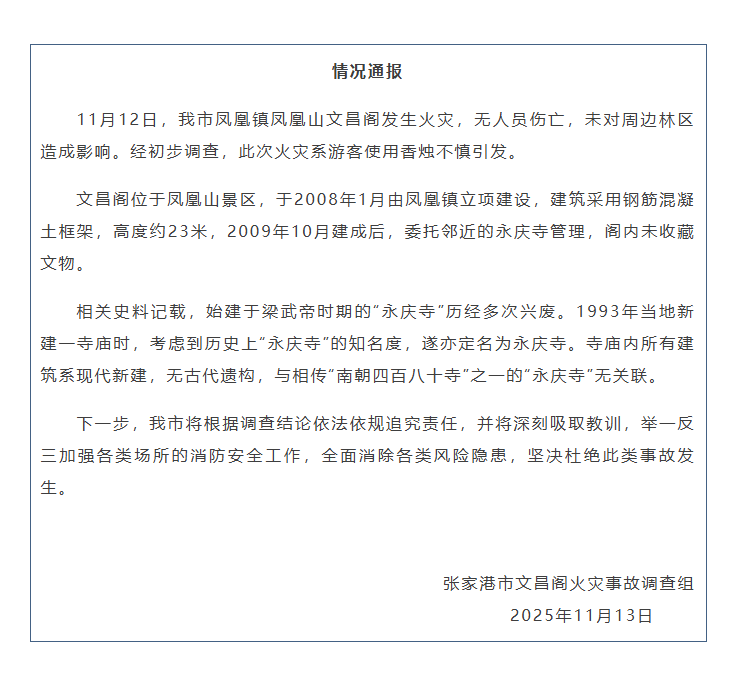 11月12日苏州张家港市凤凰镇文昌阁突发大火刚刚张家港市文昌阁火灾事故调查组发布情况通报▼▼▼11月12日,我市凤凰镇凤凰山文昌阁发生火灾,无人员伤亡,未对周边林区造成影响。经初步调查,此次火灾系游客
