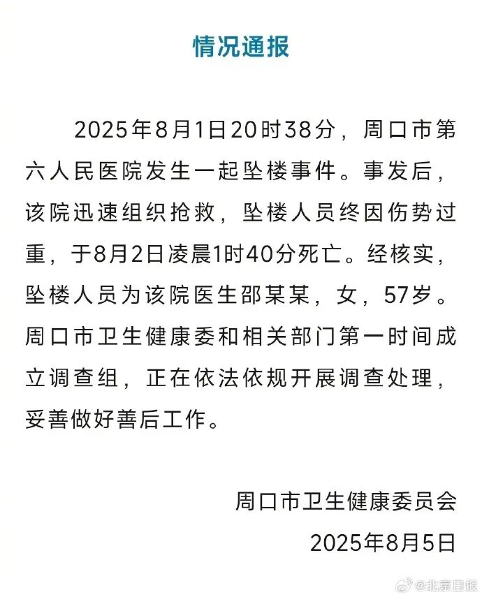 8月5日,河南周口市卫健委通报周口六院一起医生坠亡事件。2025年8月1日20时38分,周口市第六人民医院发生一起坠楼事件。事发后,该院迅速组织抢救,坠楼人员终因伤势过重,于8月2日凌晨1时40分死亡