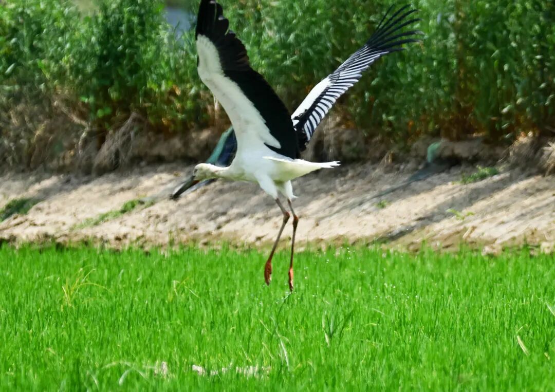 近日,沛县摄影爱好者余明亮在湖西农场稻田中捕捉到珍贵画面:一只东方白鹳正悠然觅食,时而优雅踱步,时而振翅高飞,雪白羽翼与红色长腿在绿野间格外醒目。经沛县自然资源和规划局野生动物保护站确认,此次发现系沛