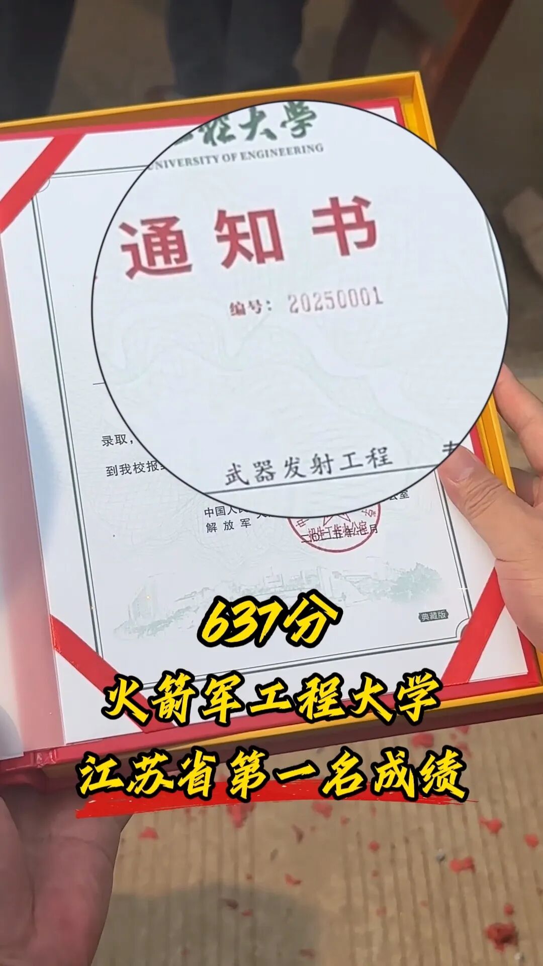 7月10日新沂高考学子周华收到了中国人民解放军火箭军工程大学的录取通知书据了解周华是江苏省首位被该校录取的学生成绩也是全省报考该校的第一名中国人民解放军火箭军工程大学(Rocket Force Uni