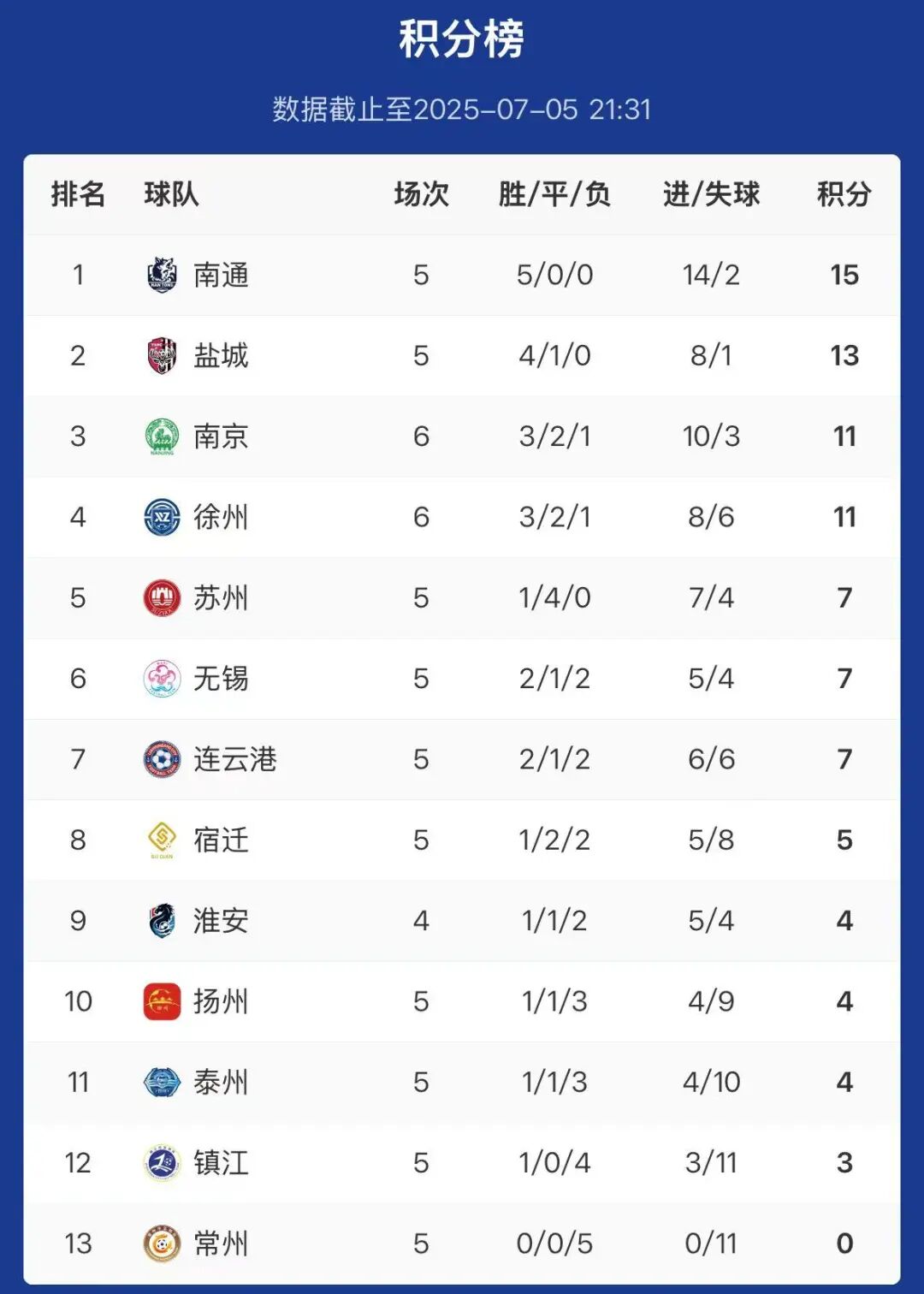 昨晚2025江苏省城市足球联赛第六轮打响徐州队1 : 2南通队扬州队0 : 2无锡队南京队0 : 0苏州队比赛过后最新积分榜公布↓↓↓根据赛程安排徐州队将于7月20日在常州市奥体中心客场迎战常州队👇