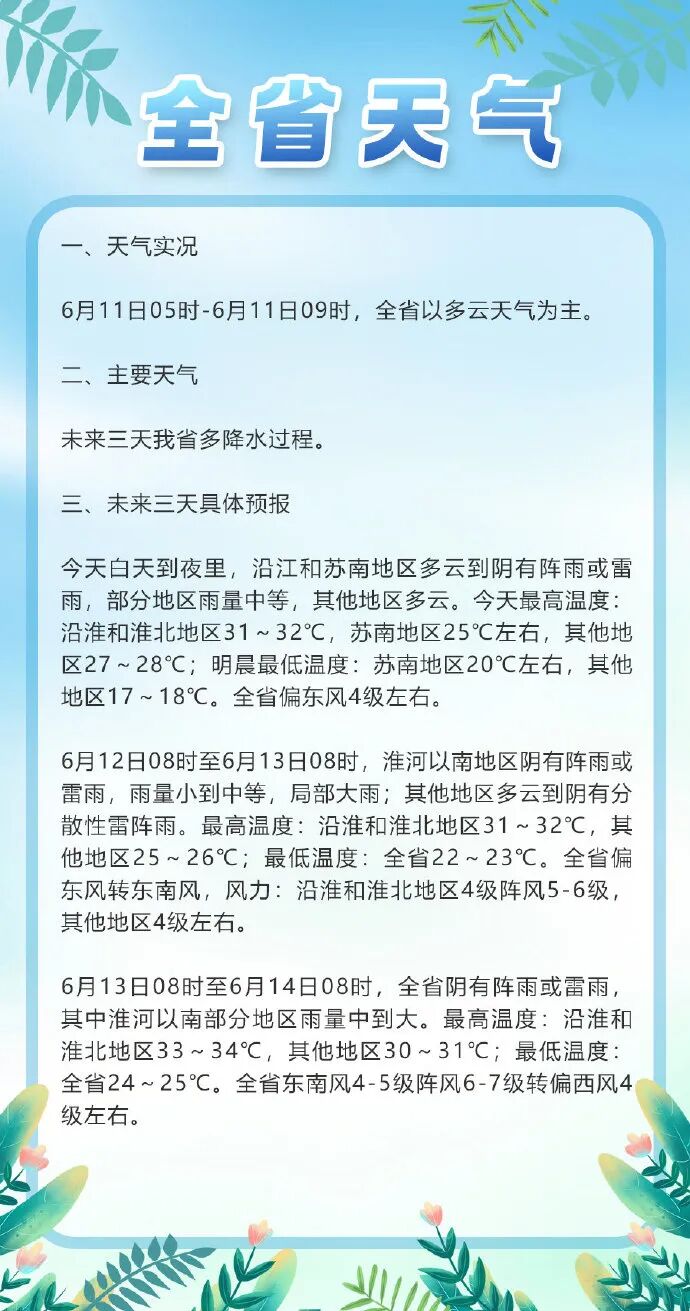 这几天徐州一直是晴好天气但是雨水又要来啦据江苏气象最新天气预报未来几天我省多降水过程徐州几号会有雨呢快来看最新的天气情况全省天气:局部大雨未来三天我省多降水过程6月11日08时至6月12日08时沿江和