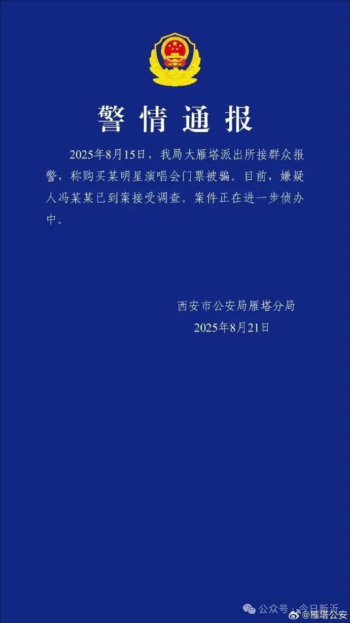 8月21日,陕西西安市公安局雁塔分局发布警情通报:2025年8月15日,我局大雁塔派出所接群众报警,称购买某明星演唱会门票被骗。目前,嫌疑人冯某某已到案接受调查。案件正在进一步侦办中。据红星新闻今日报