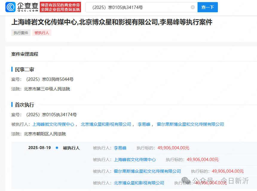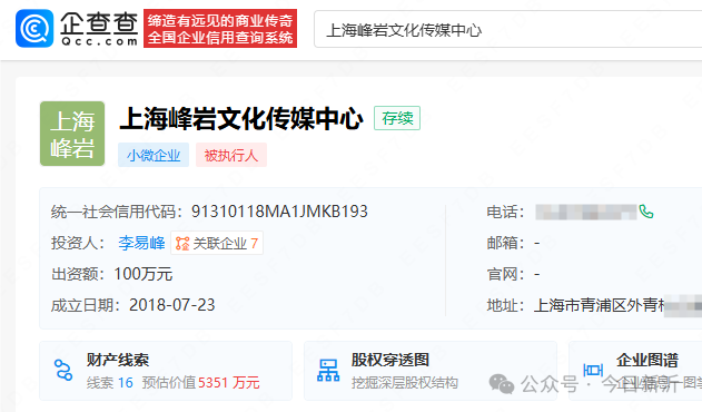 李易峰与其公司等被强制执行4990万。企查查APP显示,近日,李易峰、上海峰岩文化传媒中心、北京博众星和影视有限公司等被北京市朝阳区人民法院强制执行约4990万元。其中,上海峰岩文化传媒中心成立于20