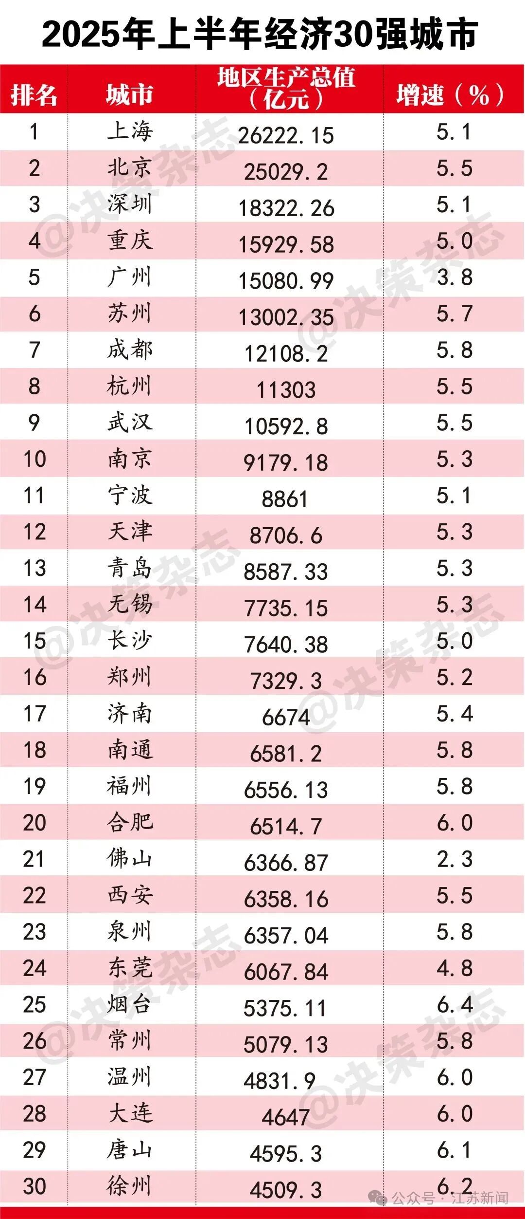 据官媒江苏新闻报道:日前,随着各地相继发布经济运行数据,2025年上半年城市地区生产总值(GDP)30强排行榜出炉。徐州上榜TOP30,上半年GDP4509.3亿元,增速6.2%!全年万亿GDP目标唾