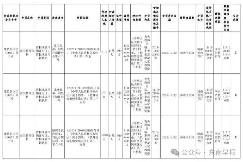 河南省教育厅于2025年12月31日正式发布《2025年撤销高校教师资格行政处罚》通告,依法对省内五名高校教师作出丧失或撤销教师资格的处理。其中,两人因违反师德师风被撤销资格,三人因触犯刑法被剥夺资格