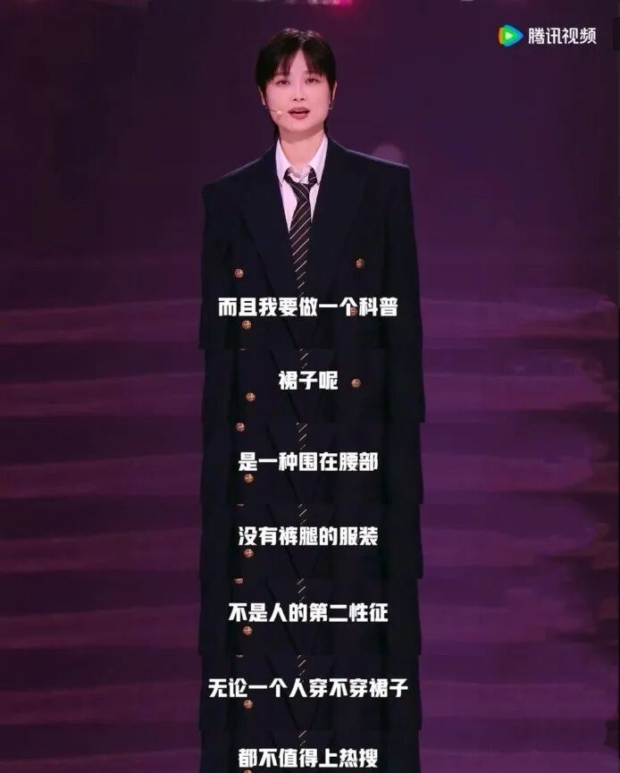 6月27日,“李宇春 裙子不是第二性征”的词条,上了热搜。此前,李宇春因身穿蓝色蓬蓬裙引发热议,“谁给李宇春穿的裙子”的话题,一度冲上热搜。在6月27日播出的某脱口秀节目中,李宇春回应了有关自己的诸多