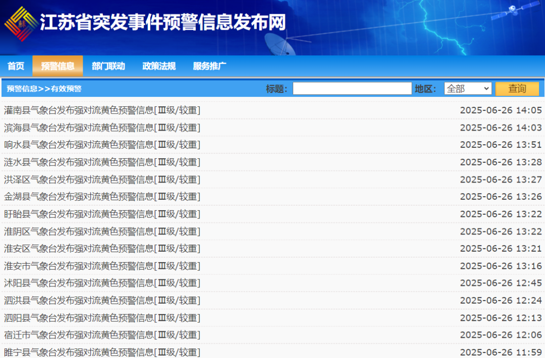 紧急提醒!截至6月26日14:25江苏连发15条预警↓↓↓预计中午到夜间徐州、连云港、宿迁、淮安、盐城中北部、扬州北部和泰州北部等地的部分地区将出现8—10级、局地11级左右的雷暴大风或弱龙卷江苏气象