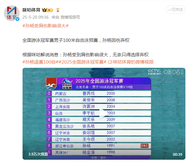 5月20日上午,2025年全国游泳冠军赛迎来第7场比赛。据悉,浙江队选手孙杨退出男子100米自由泳预赛。据咪咕解说消息:孙杨受到肩伤影响很大,无奈只得选择弃权。5月19日上午,孙杨放弃800米自由泳预