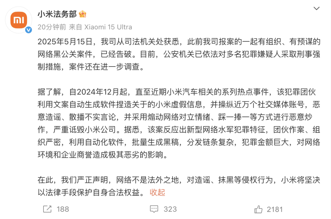 @小米法务部 微博5月19日消息,5月15日,公司从司法机关处获悉,此前公司报案的一起有组织、有预谋的网络黑公关案件,已经告破。目前,公安机关已依法对多名犯罪嫌疑人采取刑事强制措施,案件还在进一步调查