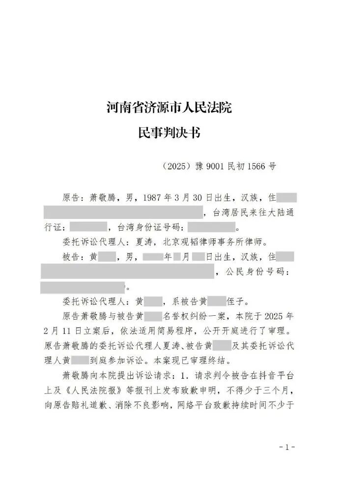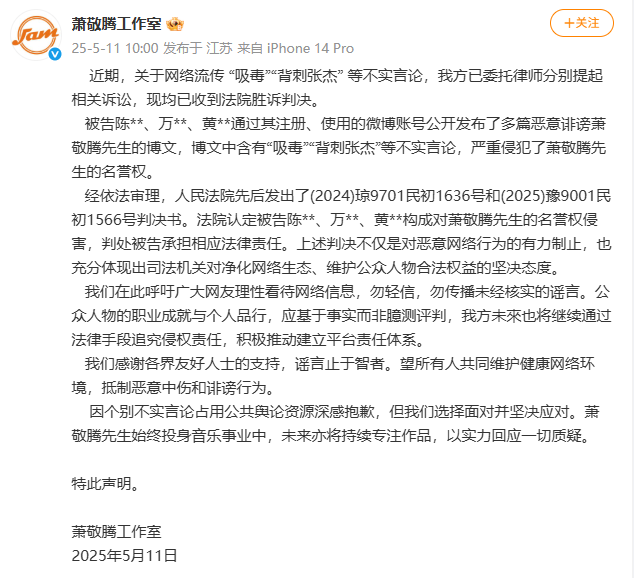 5月11日,萧敬腾工作室发布声明:关于网络流传“吸毒”“背刺张杰” 等不实言论,已委托律师分别提起相关诉讼,现均已收到法院胜诉判决。声明称,被告陈**、万**、黄**通过其注册、使用的微博账号公开发布