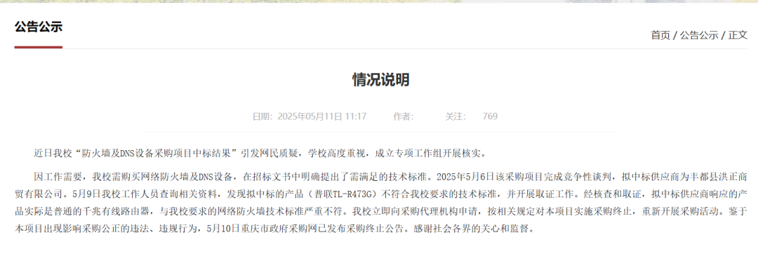 5月11日,重庆三峡学院发布情况说明:近日我校“防火墙及DNS设备采购项目中标结果”引发网民质疑,学校高度重视,成立专项工作组开展核实。因工作需要,我校需购买网络防火墙及DNS设备,在招标文书中明确提
