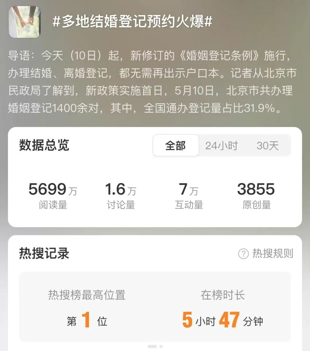 5月10日起,新修订的《婚姻登记条例》施行,多地结婚登记预约火爆,相关话题词冲上热搜第一。多地结婚登记预约火爆婚姻登记实行“全国通办”,要求婚姻登记机关应当核对结婚登记当事人出具的证件、书面材料,询问