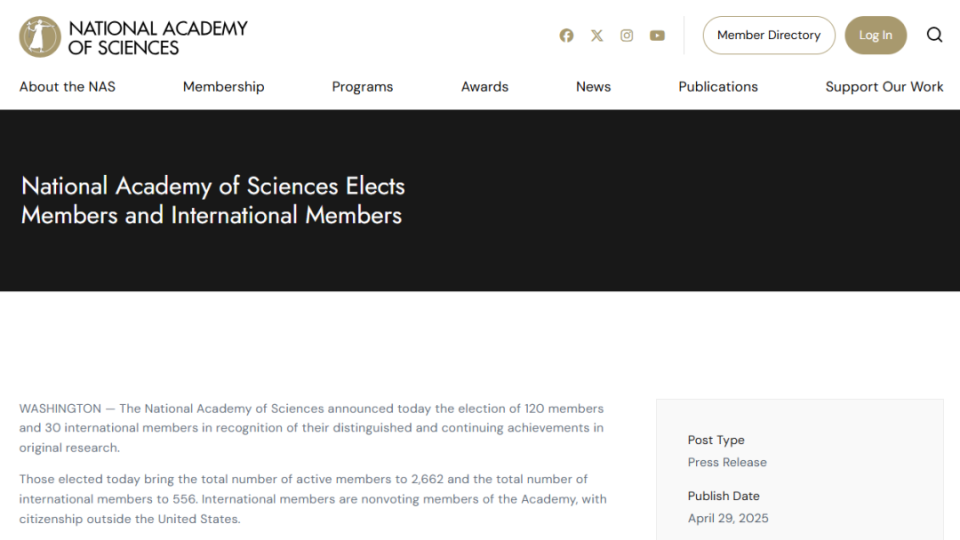 4月30日,美国国家科学院公布了新当选的院士和外籍院士。此次共计120名院士和30名外籍院士当选。诺奖得主、中国中医科学院青蒿素研究中心屠呦呦教授当选外籍院士。到现在为止,美国国家科学院院士共有266