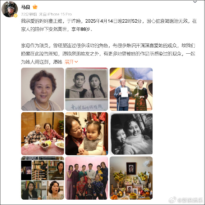 4月15日摄影家@马良 发博透露母亲童正维于昨日因心脏衰竭医治无效去世享年88岁童正维,毕业于上海戏剧学院表演系,早前一直活跃在话剧舞台。在《编辑部的故事》里成功扮演“牛大姐”后,又出演了《花儿怒放》