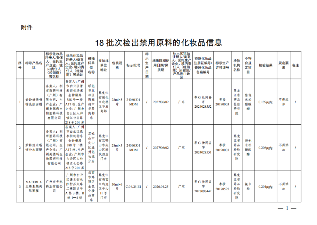 国家药监局4月14日发布通告称在2024年国家化妆品抽样检验工作中经黑龙江省药品检验研究院等单位检验产品标签标示名称为妙龄妍亮喵喵亮肤面膜等18批次化妆品不符合规定(见附件)检出《化妆品安全技术规范(