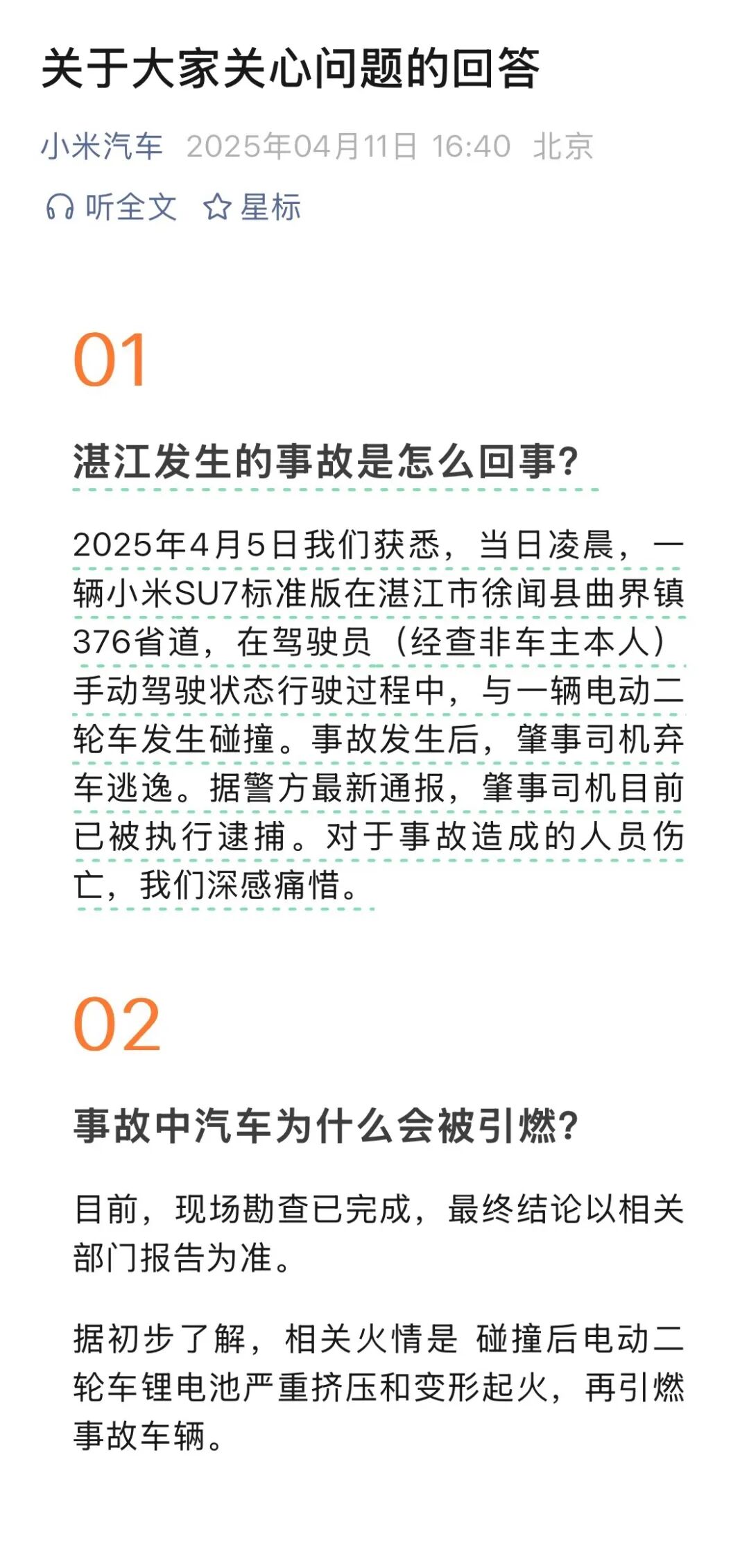近日,有网友发帖称,广东湛江徐闻曲界镇一辆小米SU7撞到两少年后逃逸,汽车随后起火焚毁。4月11日,广东湛江徐闻县公安局通报:2025年4月5日5时许,陈某(男,25岁)驾驶小汽车途经徐闻县曲界镇华海