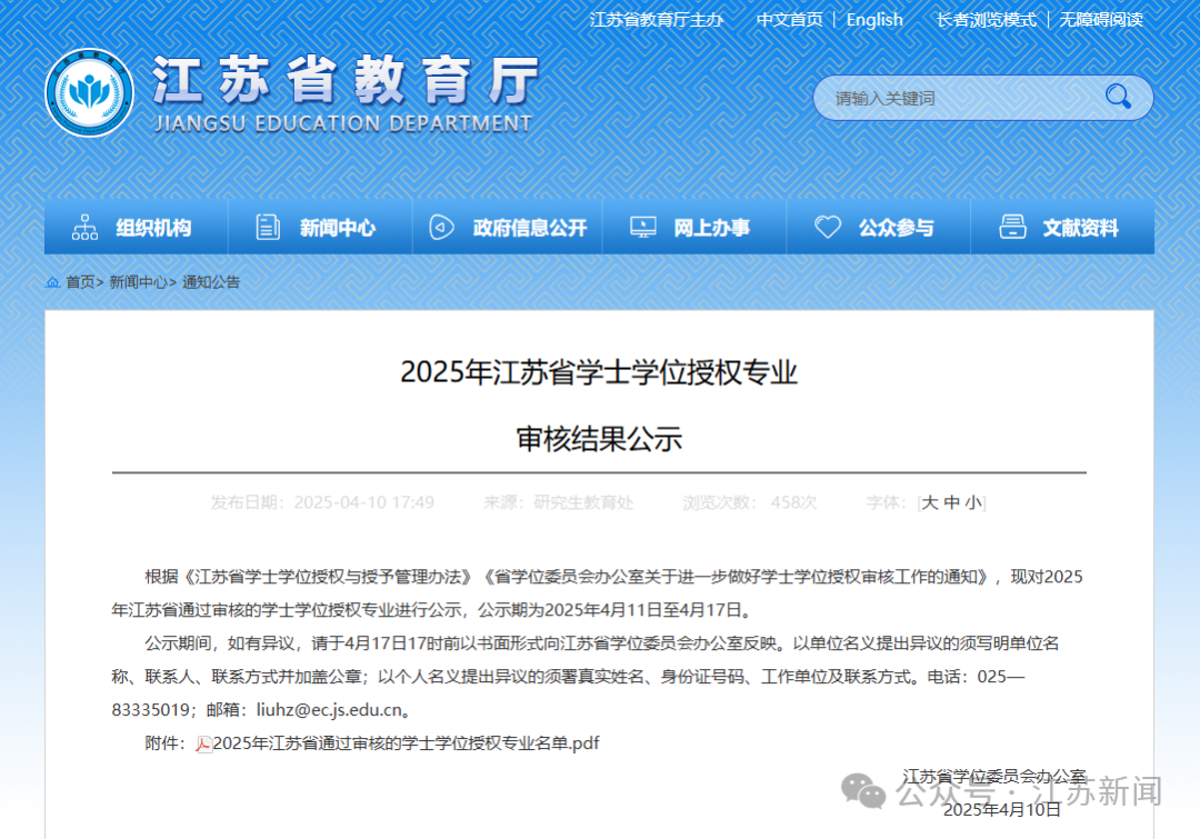 4月10日,江苏省教育厅发布2025年江苏省学士学位授权专业审核结果公示。2025年江苏省学士学位授权专业审核结果公示根据《江苏省学士学位授权与授予管理办法》《省学位委员会办公室关于进一步做好学士学位