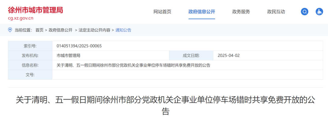 近日徐州市城市管理局发布关于清明、五一假日期间徐州市部分党政机关企事业单位停车场错时共享免费开放的公告快来一起看看吧关于清明、五一假日期间徐州市部分党政机关企事业单位停车场错时共享免费开放的公告为有效