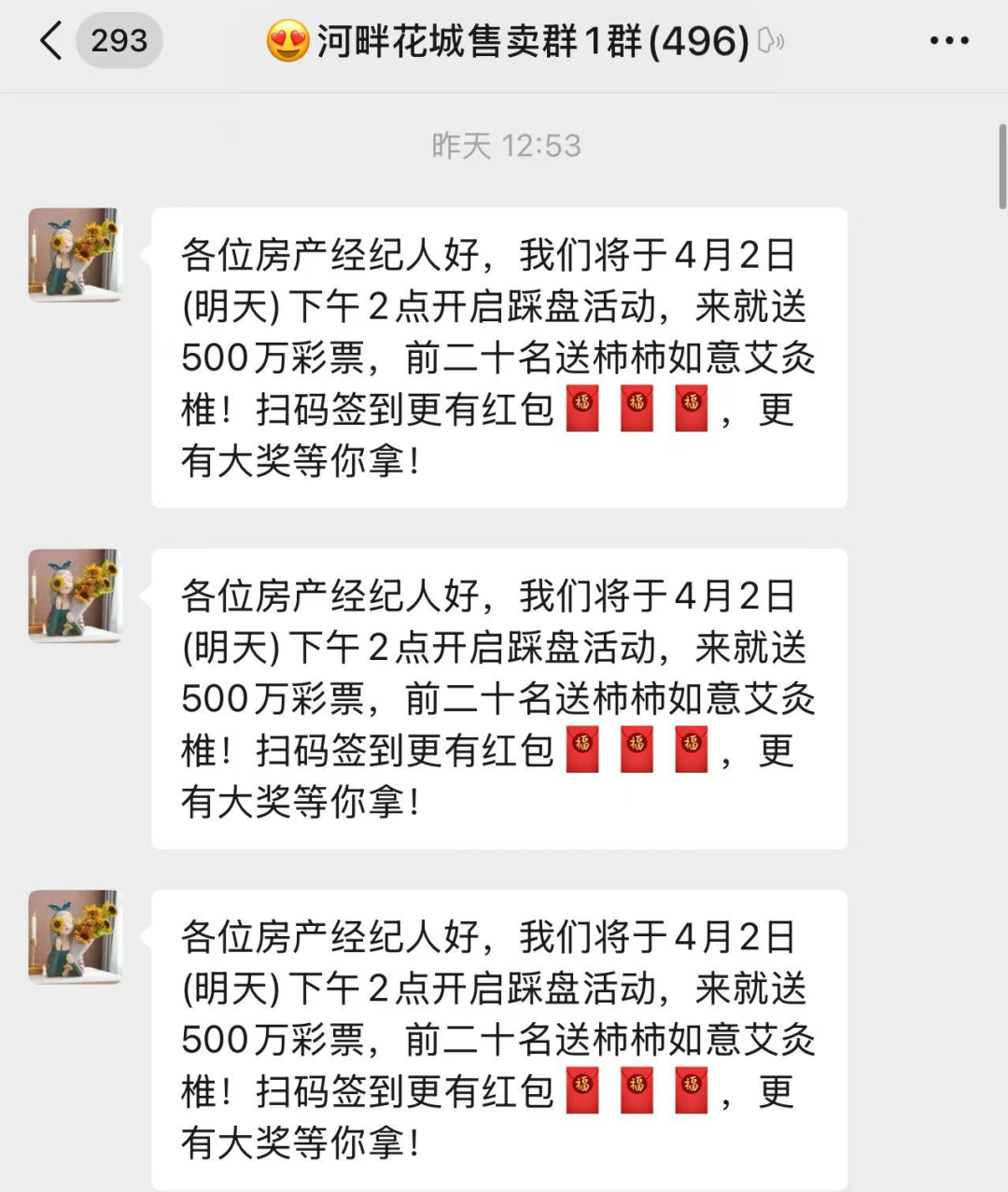 疯了!疯了!徐州二手房市场真是太卷了徐州一业主为了快速卖房迅速组织一500人中介大群拉人发红包,踩盘有奖品不到半天群就突破500人比开发商服务都到位有集中踩盘的时间踩盘还有送500万的机会奖励现场设置
