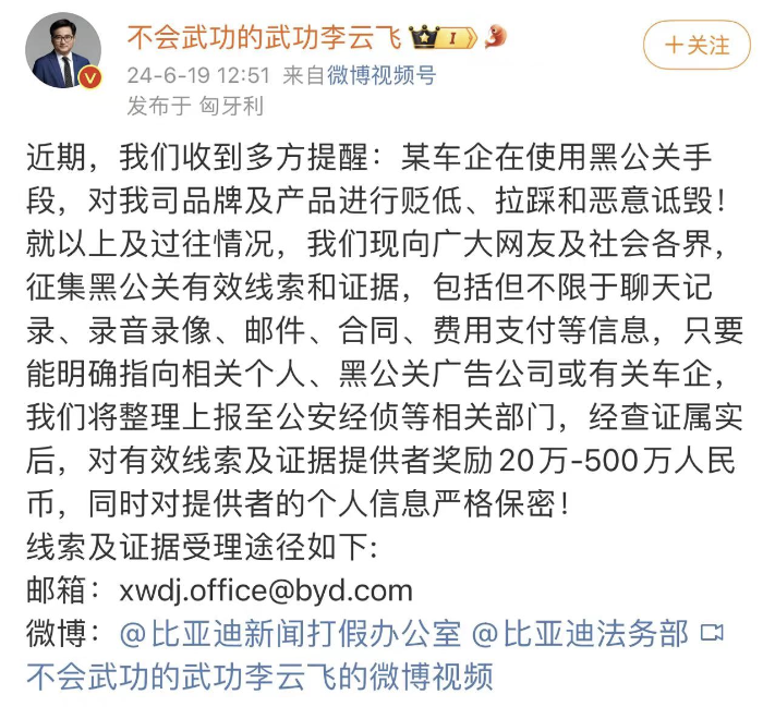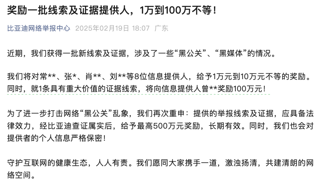 2月19日,“比亚迪网络举报中心”发文称,近期,获得一批新线索及证据,涉及了一些“黑公关”、“黑媒体”的情况。将对常**、张*、肖**、刘**等8位信息提供人,给予1万元到10万元不等的奖励。同时,就
