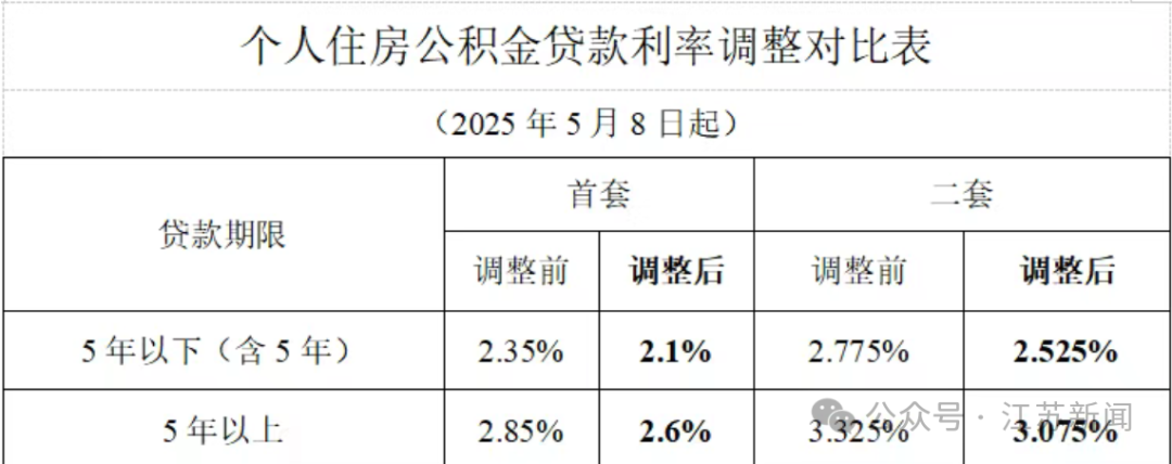 根据2025年5月7日发布的《中国人民银行关于下调个人住房公积金贷款利率的通知》,自2025年5月8日起,下调个人住房公积金贷款利率0.25个百分点,5年以下(含5年)和5年以上首套个人住房公积金贷款