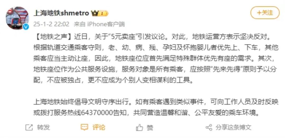 近日,一男子在某社交平台自称开价5元出让上海早高峰地铁座位的消息引发关注。#上海男子5元卖早高峰地铁座位#话题也随之冲上热搜。对此,在接受法治网记者采访时,有律师表示,地铁有偿占座行为严重的可拘留。1