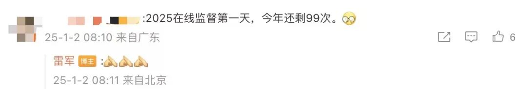 2025年1月2日一大早小米创始人、董事长兼CEO雷军在社交媒体上晒出了他在健身房的照片并配文:“2025年第一次打卡!”评论区又成“许愿池”2024年最后一晚,雷军进行了他的首次跨年直播,在直播中,