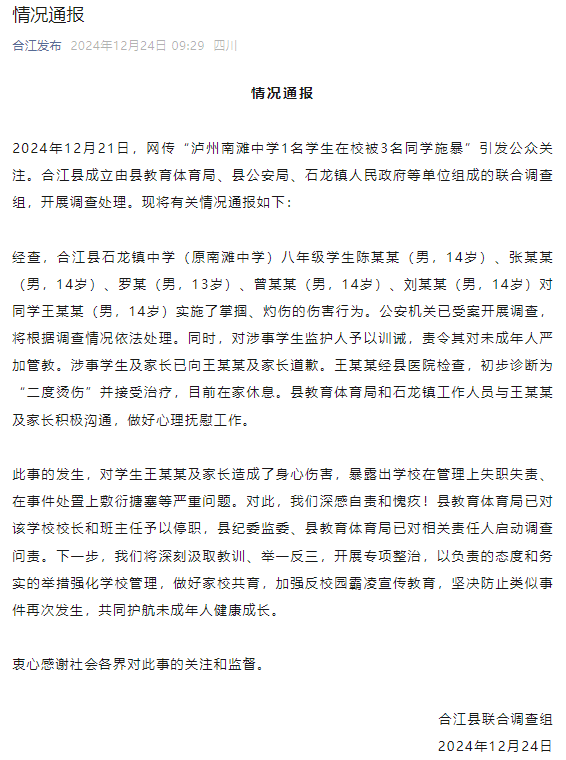 24日,“合江发布”微信公众号发布一则情况通报:2024年12月21日,网传“泸州南滩中学1名学生在校被3名同学施暴”引发公众关注。合江县成立由县教育体育局、县公安局、石龙镇人民政府等单位组成的联合调