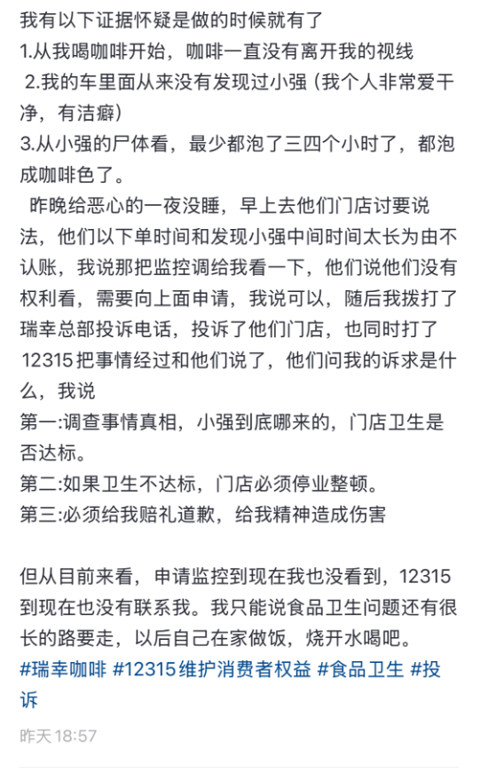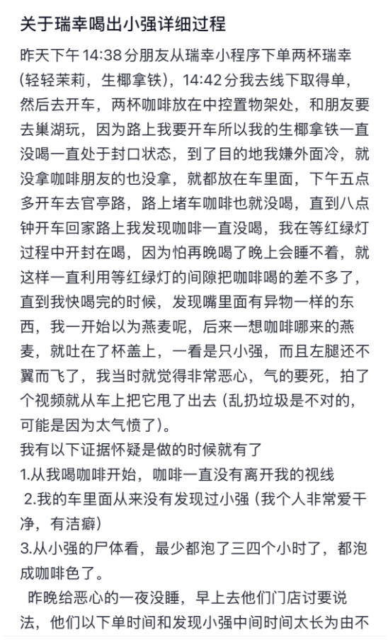 12月20日,有网友发视频报料称,在瑞幸咖啡中喝出“小强”(蟑螂)。上下滑动查看详细内容↑↓12月22日,记者联系上安徽合肥的消费者陈先生。陈先生说,12月20日14点38分,他的朋友在瑞幸小程序上下