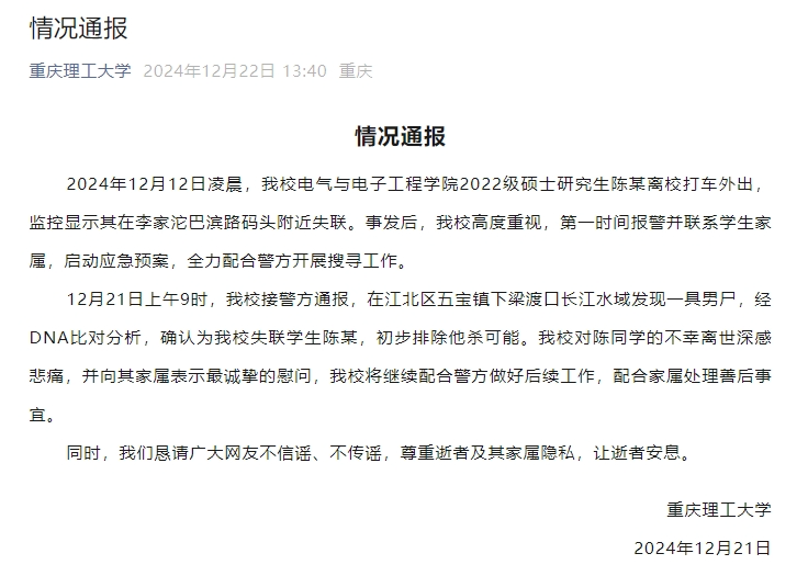 12月22日,重庆理工大学发布情况通报称,2024年12月12日凌晨,该校电气与电子工程学院2022级硕士研究生陈某离校打车外出,监控显示其在李家沱巴滨路码头附近失联。事发后,该校高度重视,第一时间报