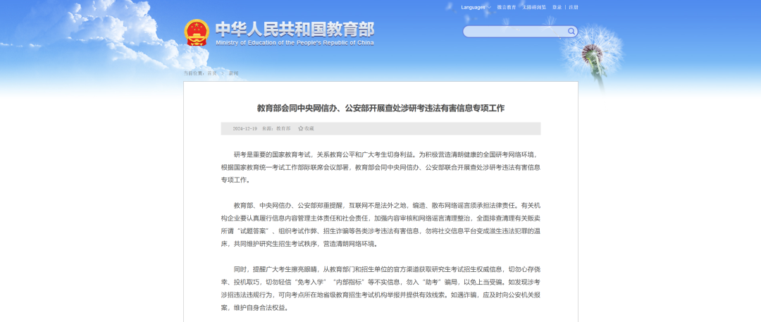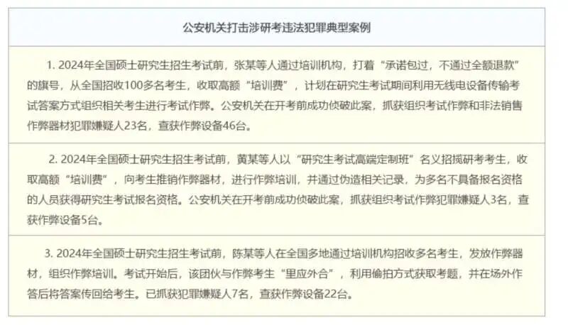 2025年全国硕士研究生招生考试在即。记者从教育部官网获悉,为积极营造清朗健康的全国研考网络环境,根据国家教育统一考试工作部际联席会议部署,教育部会同中央网信办、公安部联合开展查处涉研考违法有害信息专