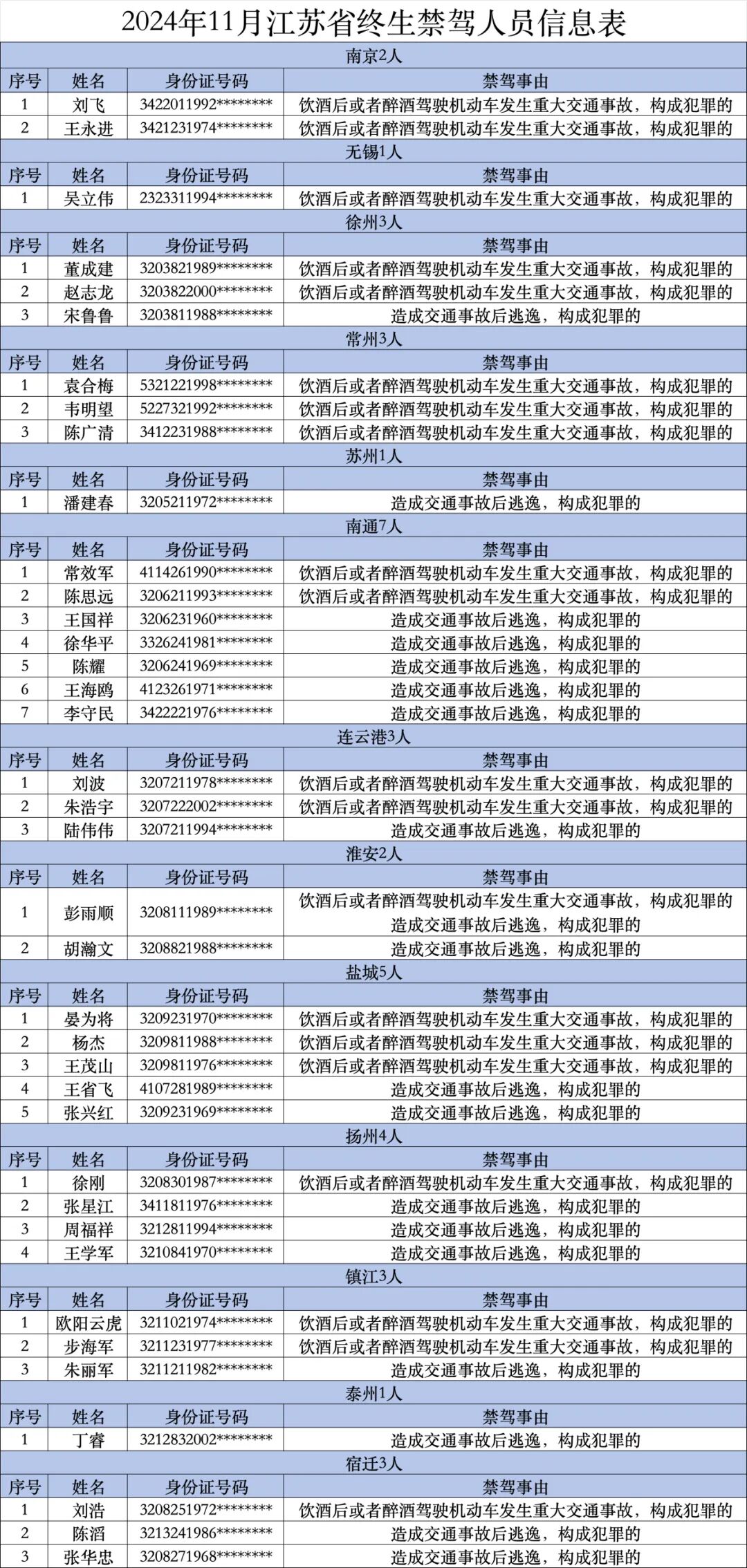 江苏交警发布2024年11月江苏省终生禁驾人员信息表全省共计38人被依法吊销机动车驾驶证且终生不得重新申领其中徐州3人具体名单如下↓↓↓普法哪些原因会被终生禁驾?《中华人民共和国道路交通安全法》第九十