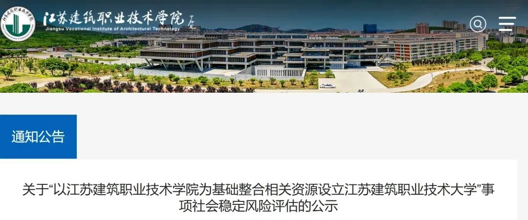 12月12日,江苏建筑职业技术学院官网发布了《关于“以江苏建筑职业技术学院为基础整合相关资源设立江苏建筑职业技术大学”事项社会稳定风险评估的公示》。江苏建筑职业技术学院官网截图公示显示,江苏建筑职业技