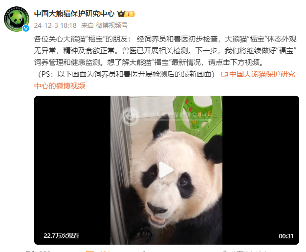12月3日晚,@中国大熊猫保护研究中心 发文回应网传“福宝”发抖一事,公布初步检查结果:各位关心大熊猫“福宝”的朋友:经饲养员和兽医初步检查,大熊猫“福宝”体态外观无异常,精神及食欲正常。兽医已开展相