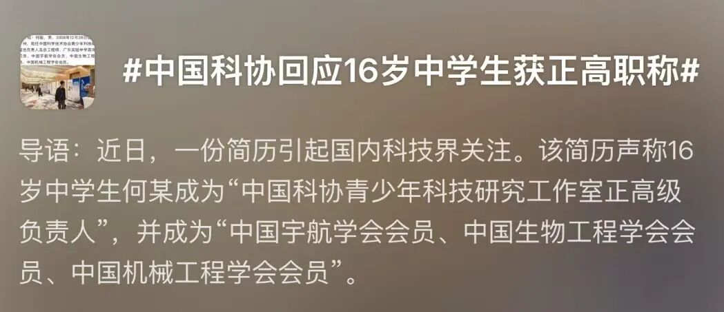 昨天(11月14日)有关“16岁中学生获正高职称”的相关话题冲上热搜引发大家讨论近日,一份简历引起国内科技界关注。该简历声称16岁中学生何某成为“中国科协青少年科技研究工作室正高级负责人”,并成为“中