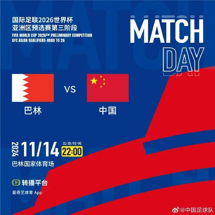 北京时间11月14日22时,2026年美加墨世界杯亚洲区预选赛18强赛第五轮比赛,中国国家男子足球队将在客场对阵巴林队。中国足球队官方发布了本场比赛的直播预告海报。海报显示,和此前的比赛一样,转播平台