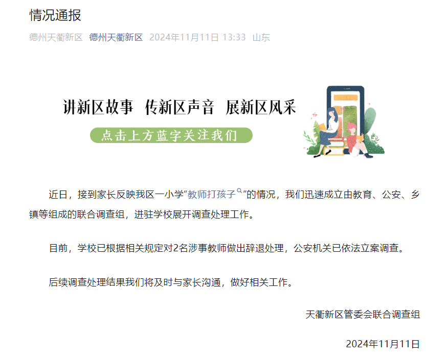 11月11日,山东德州天衢新区管委会联合调查组发布情况通报:近日,接到家长反映我区一小学“教师打孩子”的情况,我们迅速成立由教育、公安、乡镇等组成的联合调查组,进驻学校展开调查处理工作。目前,学校已根