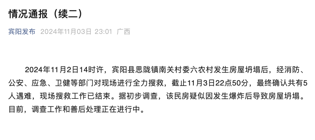 11月2日广西南宁宾阳县发生房屋坍塌事件11月3日当地发布情况通报共有5人遇难情况通报11月3日,广西南宁宾阳县发布情况通报,内容如下:2024年11月2日14时许,宾阳县思陇镇南关村委六农村发生房屋