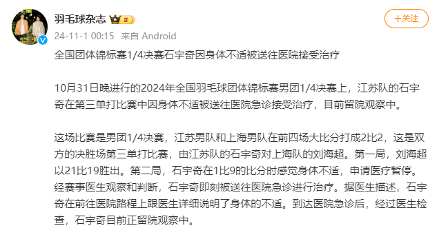 10月31日晚进行的2024年全国羽毛球团体锦标赛男团1/4决赛上,江苏队的石宇奇退赛一幕让球迷心疼不已。视频中可以看到,石宇奇呼吸有点急促,胸口起伏较大,随后被担架抬下。据中国羽毛球协会官方杂志@