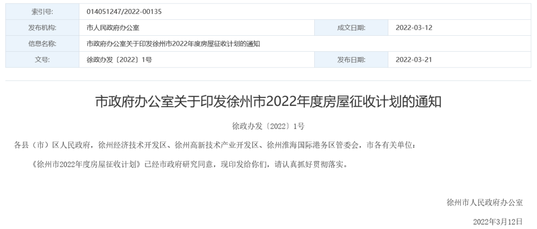 期待已久的2022年征收计划,终于来了!昨天,徐州市政府官网发布了《市政府办公室关于印发徐州市2022年度房屋征收计划的通知》。今年全市共计划征收825.31万㎡,涉及29065户,其中市区计划征收5