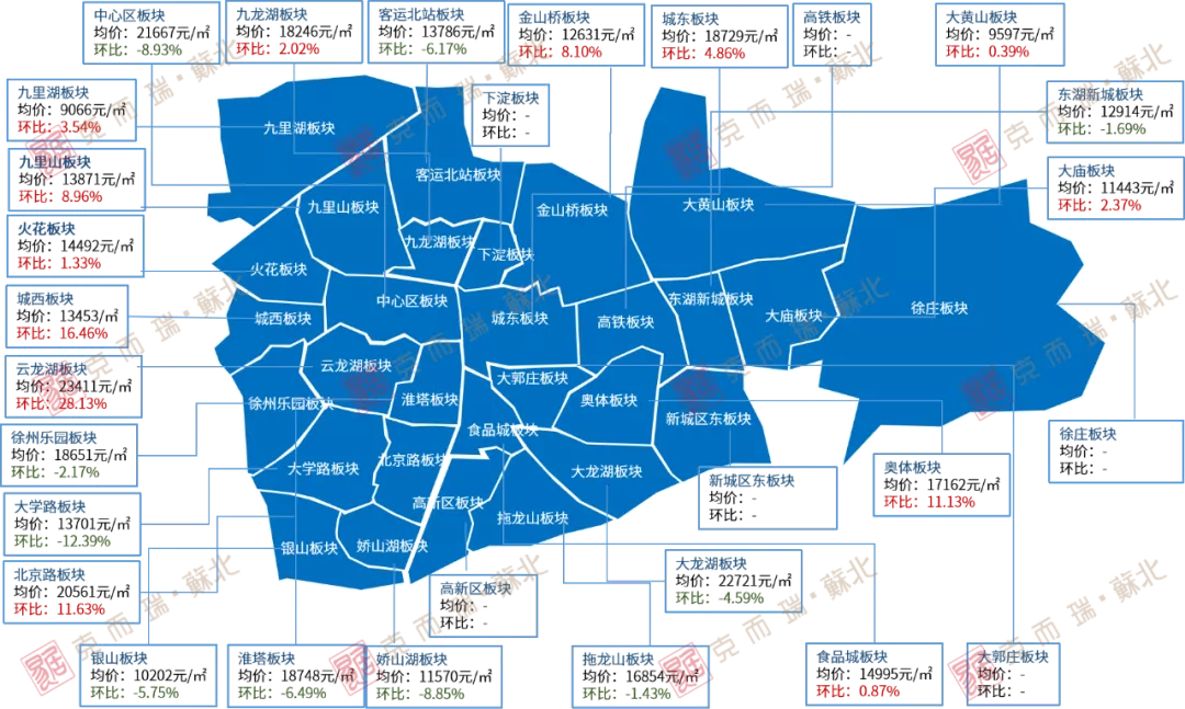 据克而瑞数据统计显示,2021年12月徐州市区商品住宅最新成交均价15636元/㎡,环比下降2.39%。具体到各区来看,12月,经济开发区成交均价为11505元/㎡,铜山区12021元/㎡,鼓楼区14