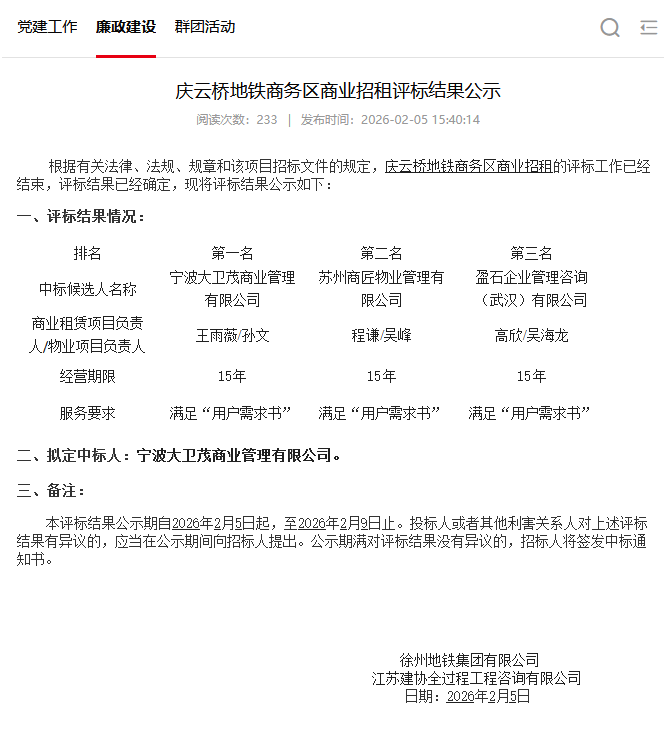 市中心这个黄金位置,马上要开新商场了!就在刚刚,徐州地铁集团发布庆云桥地铁商务区商业招租中标结果公告,庆云桥地铁上盖项目商业运营由宁波大卫茂商业管理有限公司中标,运营期限15年。宁波大卫茂,背后的股东