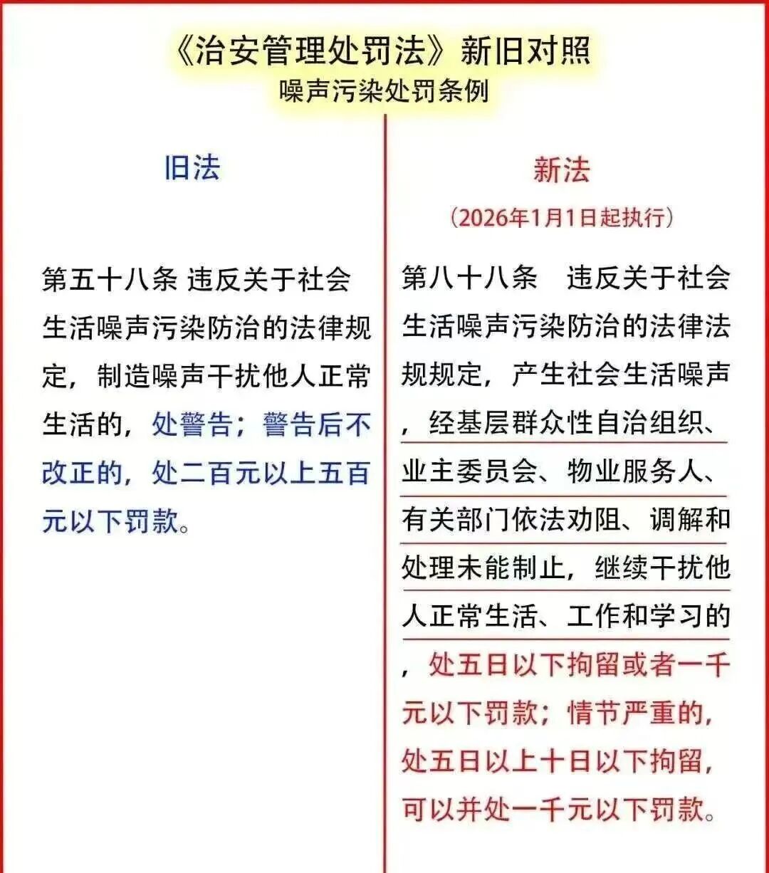 新治安管理处罚法将于2026年1月1日起正式施行。其中,噪声污染处罚条例出现明显变化。新法明确规定:生活噪音归公安管辖,不再警告+罚款,改为最高10日拘留。